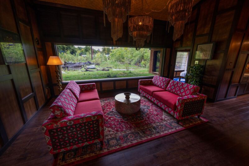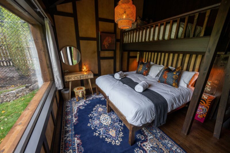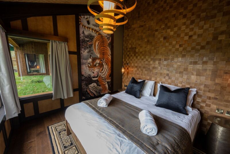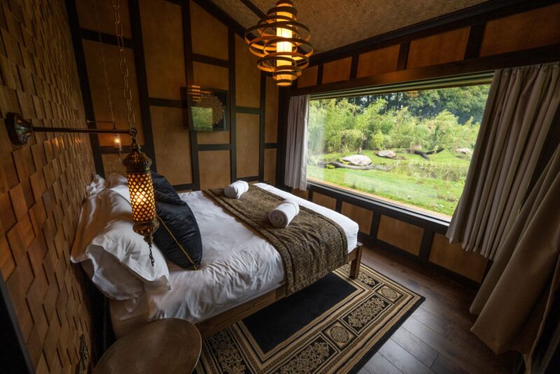 Lodges with a hot tub are detached, single-storey spaces, sleeping up to five people. These lodges feature an open-plan living and dining area and two bedrooms, all with floor-to-ceiling windows looking into the Sumatran tiger habitat. Outside you’ll find a covered garden area, with a sunken hot tub right next to a large, glass window offering a chance to get up close to this endangered species.